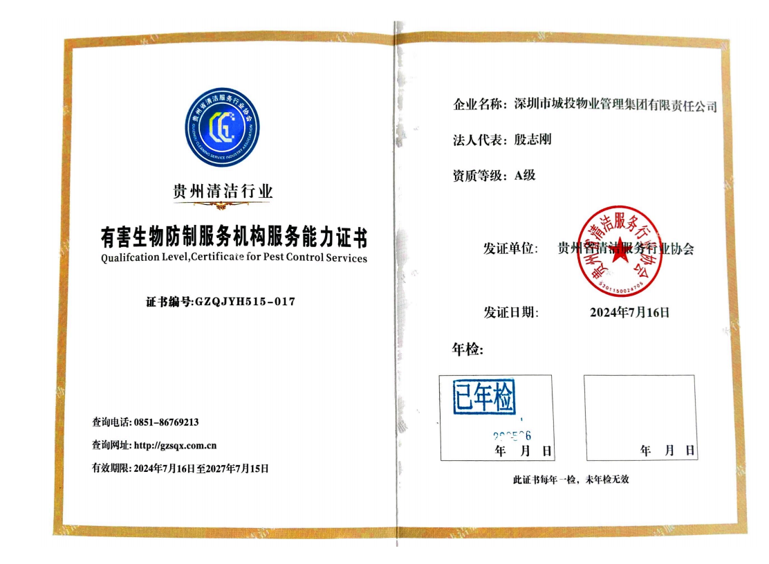 深圳市城投物业管理集团有限责任公司《有害生物防制服务机构服务能力证书》A级