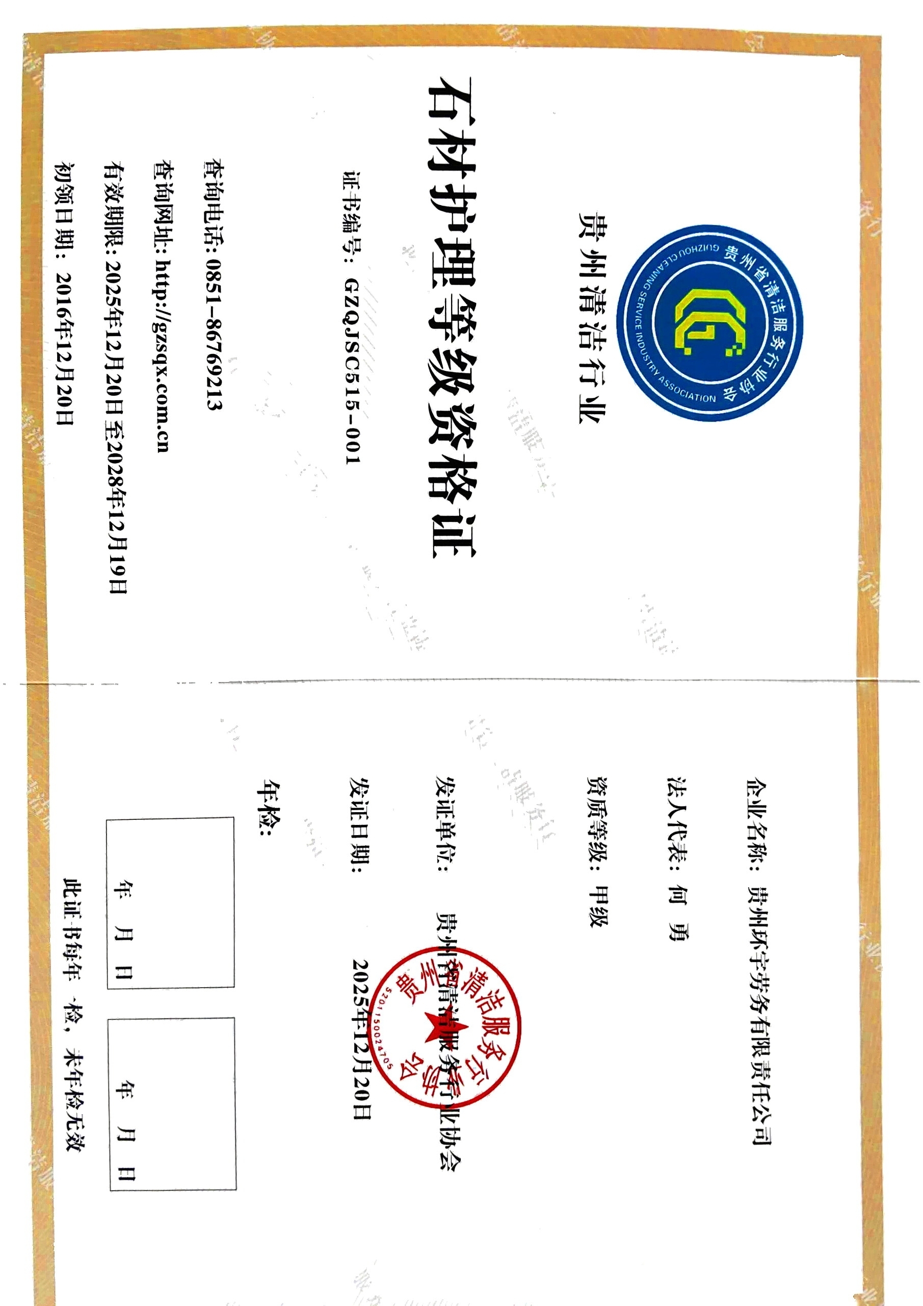 贵州环宇劳务有限责任公司《石材护理等级资格证》甲级