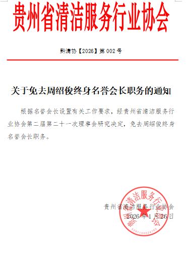 协会公告 首页 > 功能设置 > 协会公告 贵州省清洁服务行业协会关于免去周绍俊终身名誉会长职务的通知 发布时间:2026-01-26 16:46:53 发布人:贵州省清洁服务行业协会 上一篇: 省金融贸易烟酒茶业工会与省清洁服务行业协会联席会议制度正式建立 下一篇: 没有了